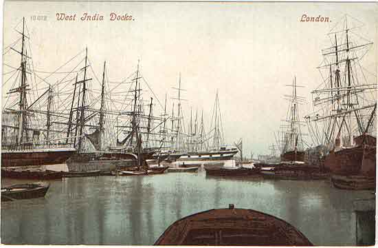 The magnificent dock system was made up of an Import Dock, 500 feet wide, and an Export Dock, opened in 1806, 400 feet wide. Both were nearly a mile long and 31 feet deep. Constructed on the north quay of the Import Dock were nine Georgian warehouses, mostly five storeys high. These were built to hold a years crop of sugar and molasses from the West Indies. On the south quay were vaults built to store West Indian Rum. To help pay for the construction of the West India Docks, the Company were given a twenty-one years monopoly on all cargoes shipped to London from the West Indies. Similar rules applied to exports to the West Indies. Vessels using the dock had the right to remain there for six months. In 1806, the Corporation of London open the City Canal, built south of the West India Docks. The City Canal cut the Isle of Dogs in two and allows shipping to reach the Pool of London without going via Greenwich. The City Canal was not popular with shipping companies as they would not pay to use it. So in 1829, the City of London Corporation sold the unprofitable City Canal to the West India Company, who named it South West India Dock and later South Dock. Through a series of mergers in the nineteenth century, caused by the lack of profits made by the London Dock Companies, eventually lead to the Government privatising the whole of the London Dock system in 1909. To manage the London Dock System and the Tidal River Thames, the Government created the Port of London Authority. The Docks were principle targets for the German bombers in the Second World War. The West India Docks were extensively damaged. Three-quarters of the magnificent north quay Georgian warehouses were destroyed. In 1980 the West India Docks closed and later became part of The Dockland Development Corporation (LDDC). They gave permission for Canary Wharf to be built between the Import Dock and the South Dock. Part of the north quay Georgian warehouses have became the Museum in Docklands. This fantastic Museum traces the history of the River Thames, the London Dock System and the people who lived and worked in and around the Great Port. |